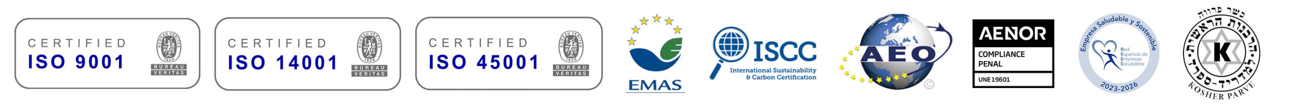 Quality, Environmental and Safety Systems meeting the requirements of ISO 9001, ISO 14001, ISO 45001, EMAS, ISCC, AEO, SNVS.